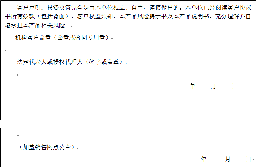 客户签名:                                    客户声明:投资决策完全是由客户独立、自主、谨慎做出的。客户已经阅读客户协议书所有条款(包括背面)、客户权益须知、本产品风险揭示书及本产品说明书,充分理解并自愿承担本产品相关风险。)