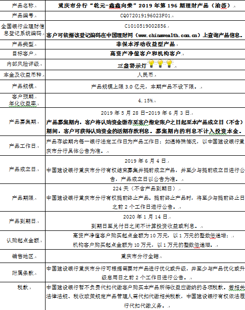 中国建设银行重庆市分行“乾元-鑫鑫向荣” 2019年第196期理财产品风险揭示书和产品说明书