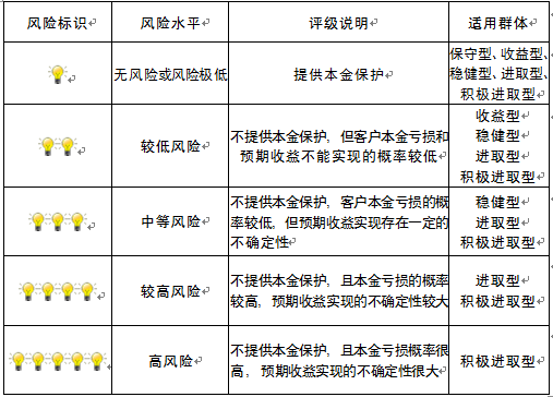 本产品为非保本浮动收益型理财产品,不保证本金和收益,请您充分认识投资风险,谨慎投资。本期产品期限为127天(中国建设银行有权对产品进行展期或提前终止),存续期内,产品不接受申购或赎回申请。本期产品内部风险评级级别为盏警示灯 ,风险水平属于较低风险。最不利情况下,您将损失全部收益甚至包括全部本金。本理财产品适用于收益型、稳健型、进取型 积极进取型客户。