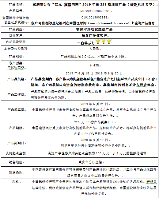 3.中国建设银行重庆市分行可根据市场情况等调整产品规模上、下限,并最迟于调整规模上下限当日进行公告。