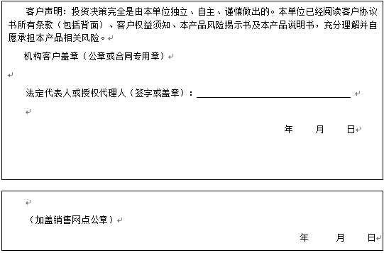 客户签名: ( 客户声明:投资决策完全是由客户独立、自主、谨慎做出的。客户已经阅读客户协议书所有条款(包括背面)、客户权益须知、本产品风险揭示书及本产品说明书,充分理解并自愿承担本产品相关风险。)
