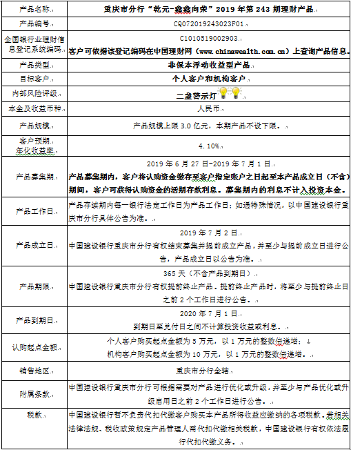 中国建设银行重庆市分行“乾元-鑫鑫向荣” 2019年第243期理财产品风险揭示书和产品说明书