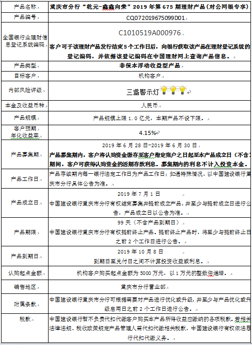 中国建设银行重庆市分行“乾元-鑫鑫向荣” 2019年第675期理财产品风险揭示书和产品说明书