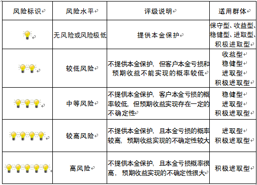 本产品为非保本浮动收益型理财产品,不保证本金和收益,请您充分认识投资风险,谨慎投资。本期产品期限为185天(中国建设银行有权对产品进行展期或提前终止),存续期内,产品不接受申购或赎回申请。本期产品内部风险评级级别为盏警示灯 ,风险水平属于中等风险。最不利情况下,您将损失全部收益甚至包括全部本金。本理财产品适用于稳健型、进取型 积极进取型客户。
