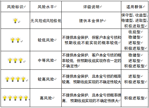 本产品为非保本浮动收益型理财产品,不保证本金和收益,请您充分认识投资风险,谨慎投资。本期产品期限为360天(中国建设银行有权对产品进行展期或提前终止),存续期内,产品不接受申购或赎回申请。本期产品内部风险评级级别为三盏警示灯 ,风险水平属于中等风险。最不利情况下,您将损失全部收益甚至包括全部本金。本理财产品适用于稳健型、进取型 、积极进取型客户。