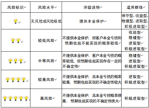 本产品为非保本浮动收益型理财产品,不保证本金和收益,请您充分认识投资风险,谨慎投资。本期产品期限为105天(中国建设银行有权对产品进行展期或提前终止),存续期内,产品不接受申购或赎回申请。本期产品内部风险评级级别为三盏警示灯,风险水平属于中等风险。最不利情况下,您将损失全部收益甚至包括全部本金。本理财产品适用于稳健型、进取型 、积极进取型客户。