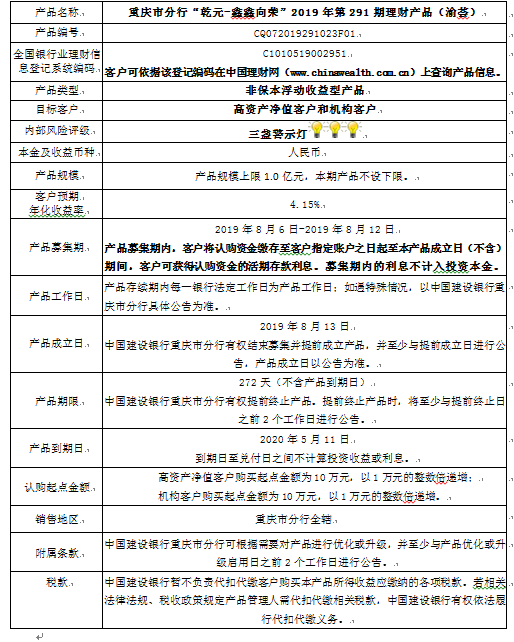 中国建设银行重庆市分行“乾元-鑫鑫向荣” 2019年第291期理财产品风险揭示书和产品说明书