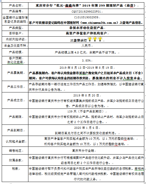 3.中国建设银行重庆市分行可根据市场情况等调整产品规模上、下限,并最迟于调整规模上下限当日进行公告。