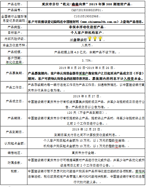3.中国建设银行重庆市分行可根据市场情况等调整产品规模上、下限,并最迟于调整规模上下限当日进行公告。