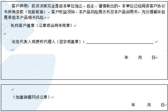 客户签名:                                    客户声明:投资决策完全是由客户独立、自主、谨慎做出的。客户已经阅读客户协议书所有条款(包括背面)、客户权益须知、本产品风险揭示书及本产品说明书,充分理解并自愿承担本产品相关风险。)