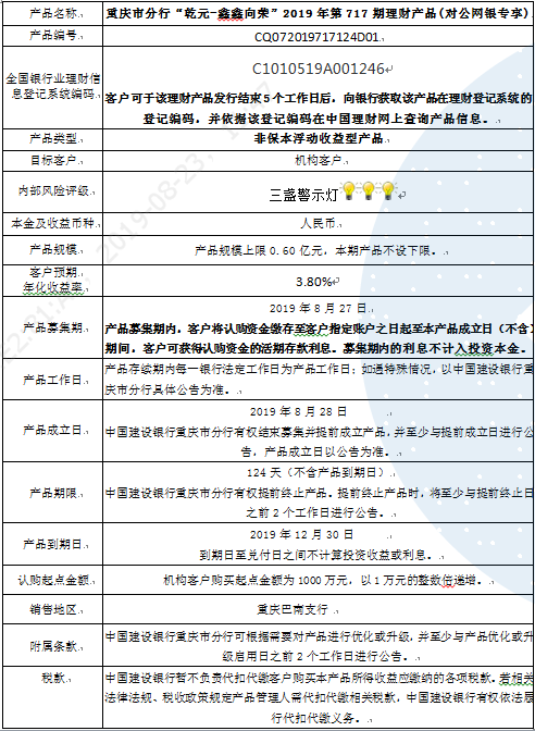 中国建设银行重庆市分行“乾元-鑫鑫向荣” 2019年第717期理财产品风险揭示书和产品说明书