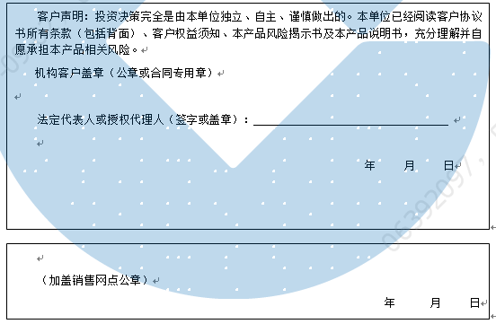客户签名:                                    客户声明:投资决策完全是由客户独立、自主、谨慎做出的。客户已经阅读客户协议书所有条款(包括背面)、客户权益须知、本产品风险揭示书及本产品说明书,充分理解并自愿承担本产品相关风险。)