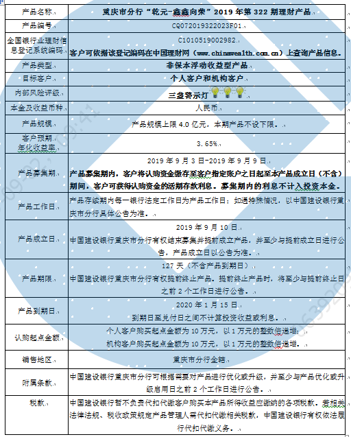 中国建设银行重庆市分行“乾元-鑫鑫向荣” 2019年第322期理财产品风险揭示书和产品说明书