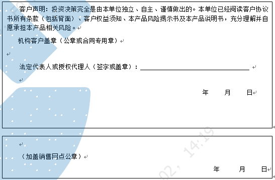 客户签名: ( 客户声明:投资决策完全是由客户独立、自主、谨慎做出的。客户已经阅读客户协议书所有条款(包括背面)、客户权益须知、本产品风险揭示书及本产品说明书,充分理解并自愿承担本产品相关风险。)