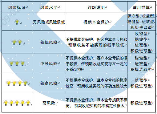 本产品为非保本浮动收益型理财产品,不保证本金和收益,请您充分认识投资风险,谨慎投资。本期产品期限为103天(中国建设银行有权对产品进行展期或提前终止),存续期内,产品不接受申购或赎回申请。本期产品内部风险评级级别为二盏警示灯 ,风险水平属于较低风险。最不利情况下,您将损失全部收益甚至包括全部本金。本理财产品适用于收益型、稳健型、进取型 、积极进取型客户。