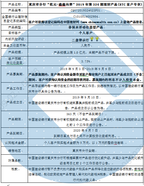 中国建设银行重庆市分行“乾元-鑫鑫向荣” 2019年第324期理财产品风险揭示书和产品说明书