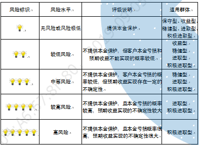 本产品为非保本浮动收益型理财产品,不保证本金和收益,请您充分认识投资风险,谨慎投资。本期产品期限为363天(中国建设银行有权对产品进行展期或提前终止),存续期内,产品不接受申购或赎回申请。本期产品内部风险评级级别为二盏警示灯 ,风险水平属于较低风险。最不利情况下,您将损失全部收益甚至包括全部本金。本理财产品适用于收益型、稳健型、进取型 、积极进取型客户。