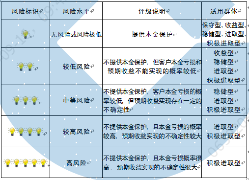本产品为非保本浮动收益型理财产品,不保证本金和收益,请您充分认识投资风险,谨慎投资。本期产品期限为300天(中国建设银行有权对产品进行展期或提前终止),存续期内,产品不接受申购或赎回申请。本期产品内部风险评级级别为三盏警示灯 ,风险水平属于中等风险。最不利情况下,您将损失全部收益甚至包括全部本金。本理财产品适用于稳健型、进取型 、积极进取型客户。