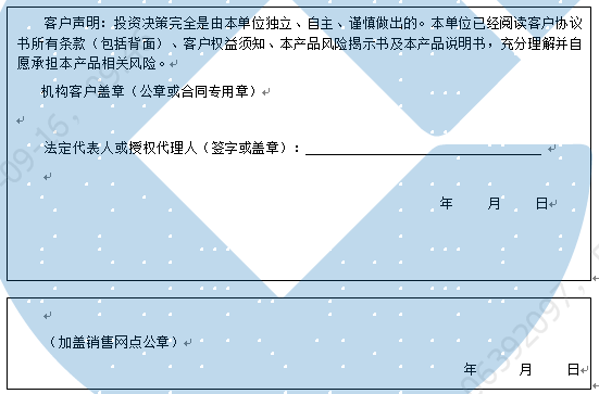 客户签名: ( 客户声明:投资决策完全是由客户独立、自主、谨慎做出的。客户已经阅读客户协议书所有条款(包括背面)、客户权益须知、本产品风险揭示书及本产品说明书,充分理解并自愿承担本产品相关风险。)