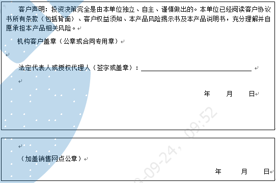 客户签名:                                    客户声明:投资决策完全是由客户独立、自主、谨慎做出的。客户已经阅读客户协议书所有条款(包括背面)、客户权益须知、本产品风险揭示书及本产品说明书,充分理解并自愿承担本产品相关风险。)