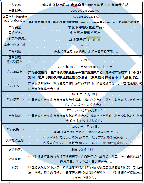 2019年第352期理财产品说明书