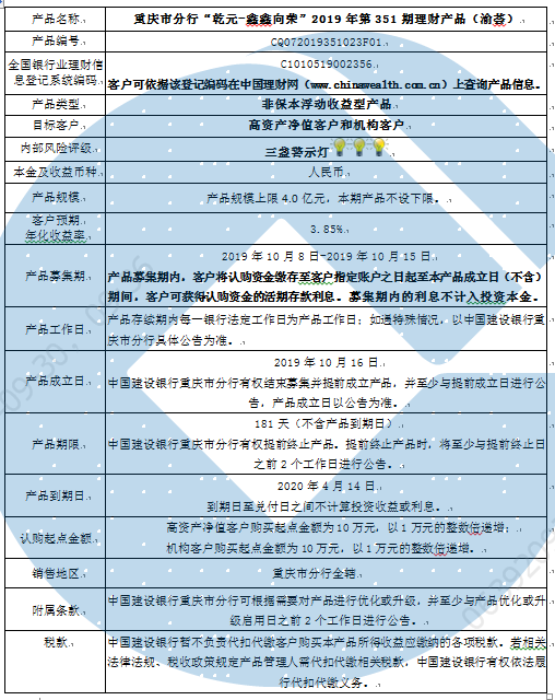 3.中国建设银行重庆市分行可根据市场情况等调整产品规模上、下限,并最迟于调整规模上下限当日进行公告。