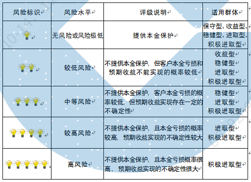 本产品为非保本浮动收益型理财产品,不保证本金和收益,请您充分认识投资风险,谨慎投资。本期产品期限为272天(中国建设银行有权对产品进行展期或提前终止),存续期内,产品不接受申购或赎回申请。本期产品内部风险评级级别为三盏警示灯 ,风险水平属于中等风险。最不利情况下,您将损失全部收益甚至包括全部本金。本理财产品适用于稳健型、进取型 、积极进取型客户。