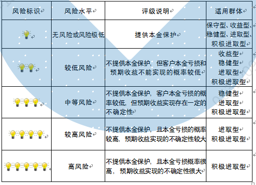 本产品为非保本浮动收益型理财产品,不保证本金和收益,请您充分认识投资风险,谨慎投资。本期产品期限为127天(中国建设银行有权对产品进行展期或提前终止),存续期内,产品不接受申购或赎回申请。本期产品内部风险评级级别为三盏警示灯 ,风险水平属于中等风险。最不利情况下,您将损失全部收益甚至包括全部本金。本理财产品适用于稳健型、进取型 、积极进取型客户。