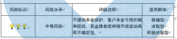 本产品为封闭式净值型理财产品,不保证本金和收益,请您充分认识投资风险,谨慎投资。本产品任何业绩比较基准、测算收益或类似表述均属不具有法律约束力的用语,不代表客户可能获得的实际收益,亦不构成中国建设银行重庆市分行对本产品的任何收益承诺。产品期限为固定期限(中国建设银行重庆市分行有权提前终止产品),存续期内产品不接受赎回申请。 本期产品内部风险评级级别为三盏警示灯 ,风险程度属于中等风险,适用于稳健型、进取型和积极进取型客户。最不利情况下,本期产品投资的资产无法回收任何本金和净收益,客户将损失全部本金。投资者不得使用贷款、发行债券等筹集的非自有资金投资本产品。如影响您风险承受能力的因素发生变化,请及时完成风险承受能力评估。