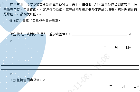 客户签名: ( 客户声明:投资决策完全是由客户独立、自主、谨慎做出的。客户已经阅读客户协议书所有条款(包括背面)、客户权益须知、本产品风险揭示书及本产品说明书,充分理解并自愿承担本产品相关风险。)