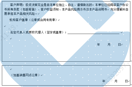 客户签名: ( 客户声明:投资决策完全是由客户独立、自主、谨慎做出的。客户已经阅读客户协议书所有条款(包括背面)、客户权益须知、本产品风险揭示书及本产品说明书,充分理解并自愿承担本产品相关风险。)