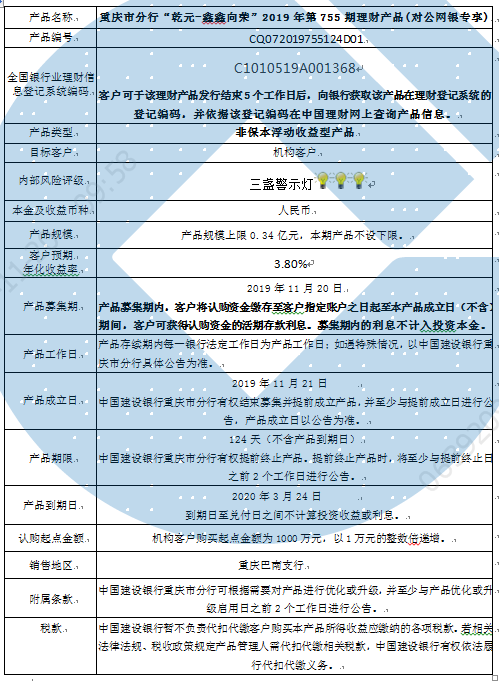 1.本期产品规模上限:0.34亿元。在本期产品募集期内,对本期产品的认购金额达到本期理财产品规模上限,则中国建设银行重庆市分行有权利但无义务停止本期产品的认购,已经认购成功的客户投资权益不受影响。