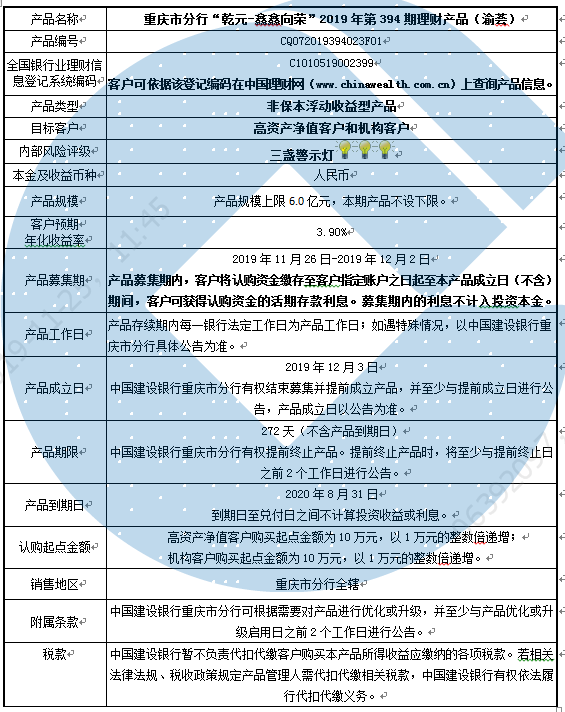 (2)剩余收益率如等于客户预期年化收益率,则客户收益按预期年化收益率3.90%计算,中国建设银行重庆市分行将不再收取其他任何费用;