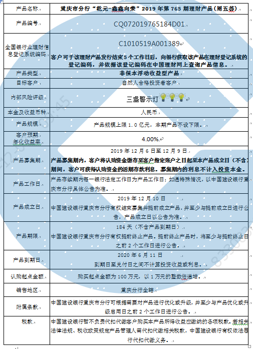 2019年第765期理财产品说明书