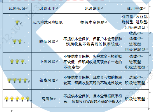 本产品为非保本浮动收益型理财产品,不保证本金和收益,请您充分认识投资风险,谨慎投资。本期产品期限为365天(中国建设银行有权对产品进行展期或提前终止),存续期内,产品不接受申购或赎回申请。本期产品内部风险评级级别为三盏警示灯 ,风险水平属于中等风险。最不利情况下,您将损失全部收益甚至包括全部本金。本理财产品适用于稳健型、进取型 、积极进取型客户。