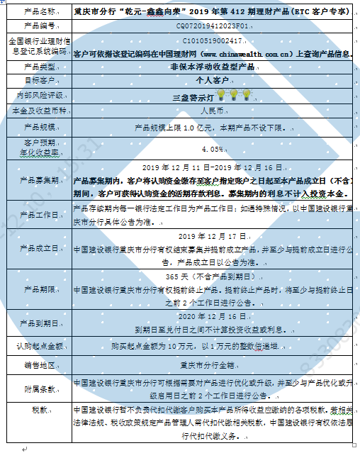 2019年第412期理财产品说明书