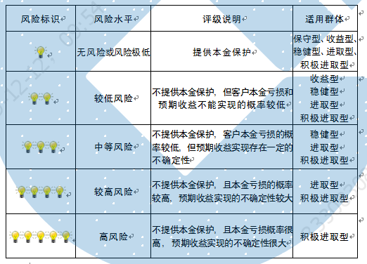 本产品为非保本浮动收益型理财产品,不保证本金和收益,请您充分认识投资风险,谨慎投资。本期产品期限为122天(中国建设银行有权对产品进行展期或提前终止),存续期内,产品不接受申购或赎回申请。本期产品内部风险评级级别为三盏警示灯,风险水平属于中等风险。最不利情况下,您将损失全部收益甚至包括全部本金。本理财产品适用于稳健型、进取型 、积极进取型客户。