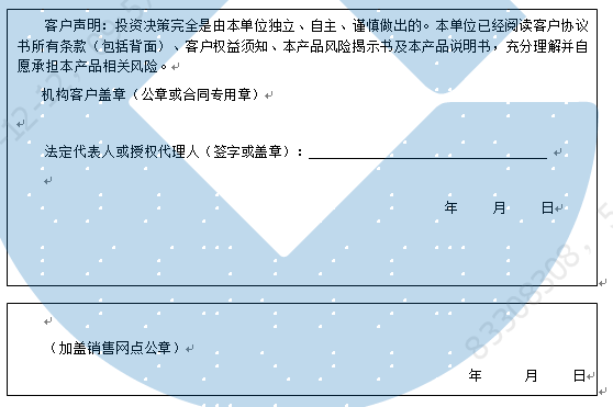 客户签名: ( 客户声明:投资决策完全是由客户独立、自主、谨慎做出的。客户已经阅读客户协议书所有条款(包括背面)、客户权益须知、本产品风险揭示书及本产品说明书,充分理解并自愿承担本产品相关风险。)