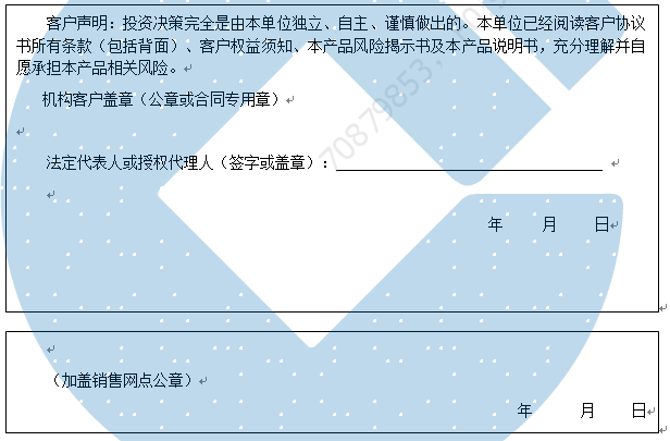 客户签名: ( 客户声明:投资决策完全是由客户独立、自主、谨慎做出的。客户已经阅读客户协议书所有条款(包括背面)、客户权益须知、本产品风险揭示书及本产品说明书,充分理解并自愿承担本产品相关风险。)