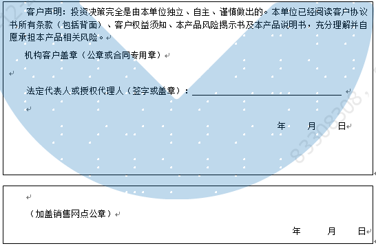 客户签名: ( 客户声明:投资决策完全是由客户独立、自主、谨慎做出的。客户已经阅读客户协议书所有条款(包括背面)、客户权益须知、本产品风险揭示书及本产品说明书,充分理解并自愿承担本产品相关风险。)