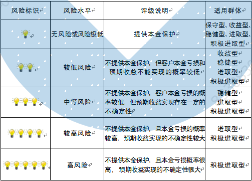 本期产品内部风险评级级别为三盏警示灯,风险水平属于中等风险。产品适合于稳健型、进取型 、积极进取型客户。最不利情况下,基础资产无法回收任何本金和收益,客户将损失全部本金。客户不得使用贷款、发行债券等筹集的非自有资金投资本产品。