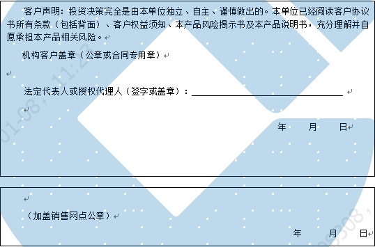 客户签名: ( 客户声明:投资决策完全是由客户独立、自主、谨慎做出的。客户已经阅读客户协议书所有条款(包括背面)、客户权益须知、本产品风险揭示书及本产品说明书,充分理解并自愿承担本产品相关风险。)