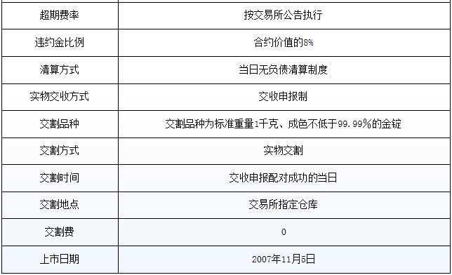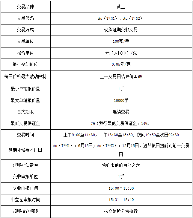 新增T+N黄金延期合约,交易代码分别为Au(T+N1)、Au(T+N2),交易方式为“现货延期交收交易”,合约最小价格变动为0.05元/克,交易单位为100克/手,最小单笔报价量为1手,最大单笔报价量为10000手。Au(T+N1)、Au(T+N2)最小交收申报量均为1手,交割品种为标准重量1千克、成色不低于99.99%的金锭。