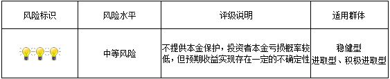 本期产品为非保本浮动收益型理财产品,不保证本金和收益,请您充分认识投资风险,谨慎投资。本期产品期限211天(中国建设银行有权对本期产品进行展期和提前终止),存续期内产品不接受申购或赎回申请。本期产品内部风险评级级别为3盏警示灯 ,风险程度属于中等风险。最不利情况下,资产组合无法回收任何本金和净收益,客户将损失全部本金。产品适合于稳健型、进取型及积极进取型客户。