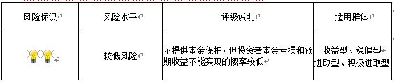 本期产品为非保本浮动收益型理财产品,不保证本金和收益,请您充分认识投资风险,谨慎投资。本期产品期限131天(中国建设银行有权对本期产品进行展期和提前终止),存续期内产品不接受申购或赎回申请。本期产品内部风险评级级别为2盏警示灯 ,风险程度属于较低风险。最不利情况下,资产组合无法回收任何本金和净收益,客户将损失全部本金。产品适合于收益型、稳健型、进取型、积极进取型客户。