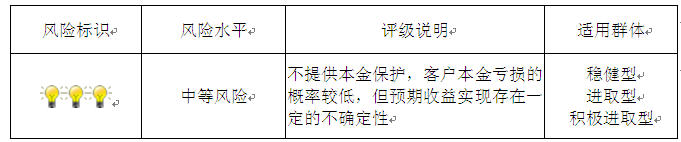 本期产品为非保本浮动收益型理财产品,不保证本金和收益,请您充分认识投资风险,谨慎投资。本期产品期限147天(中国建设银行有权对本期产品进行展期和提前终止),存续期内产品不接受申购或赎回申请。本期产品内部风险评级级别为3盏警示灯 ,风险程度属于较低风险。最不利情况下,资产组合无法回收任何本金和净收益,客户将损失全部本金。产品适合于收益型、稳健型、进取型、积极进取型客户。