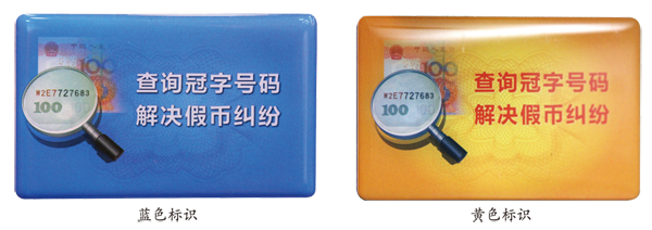 已实现冠字号码查询的现钞支付终端(自动柜员机、银行柜台),会张贴蓝色或黄色冠字号码可查询标识。张贴蓝色标识是指可实现取款业务信息与冠字号码记录的关联,能在假币纠纷中向客户提供取出现钞的冠字号码(文本及图像信息),且提供的冠字号码与现钞能一一对应;张贴黄色标识是指无法在假币纠纷中一一对应地向客户提供取出现钞的冠字号码,但可提供业务发生当天(或时段)该设备内各钞箱所有现钞的冠字号码(文本及图像信息)或业务发生时段该柜台取款现钞的冠字号码。
