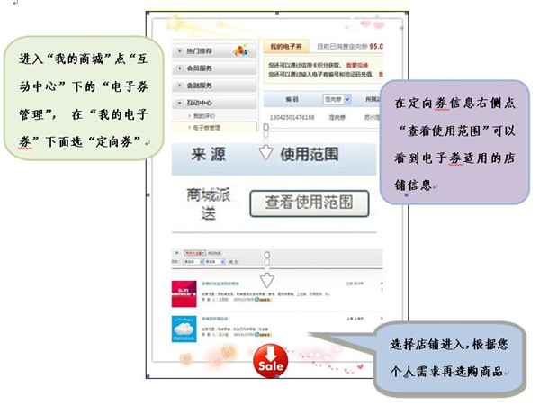 还可以点击“电子券管理”的“我的电子券”选“定向券”,显示您持有的所有的电子券信息,点电子券右边“使用范围”可以看到电子券可以支持使用所有店铺信息,根据您个人需要选择购买商品。