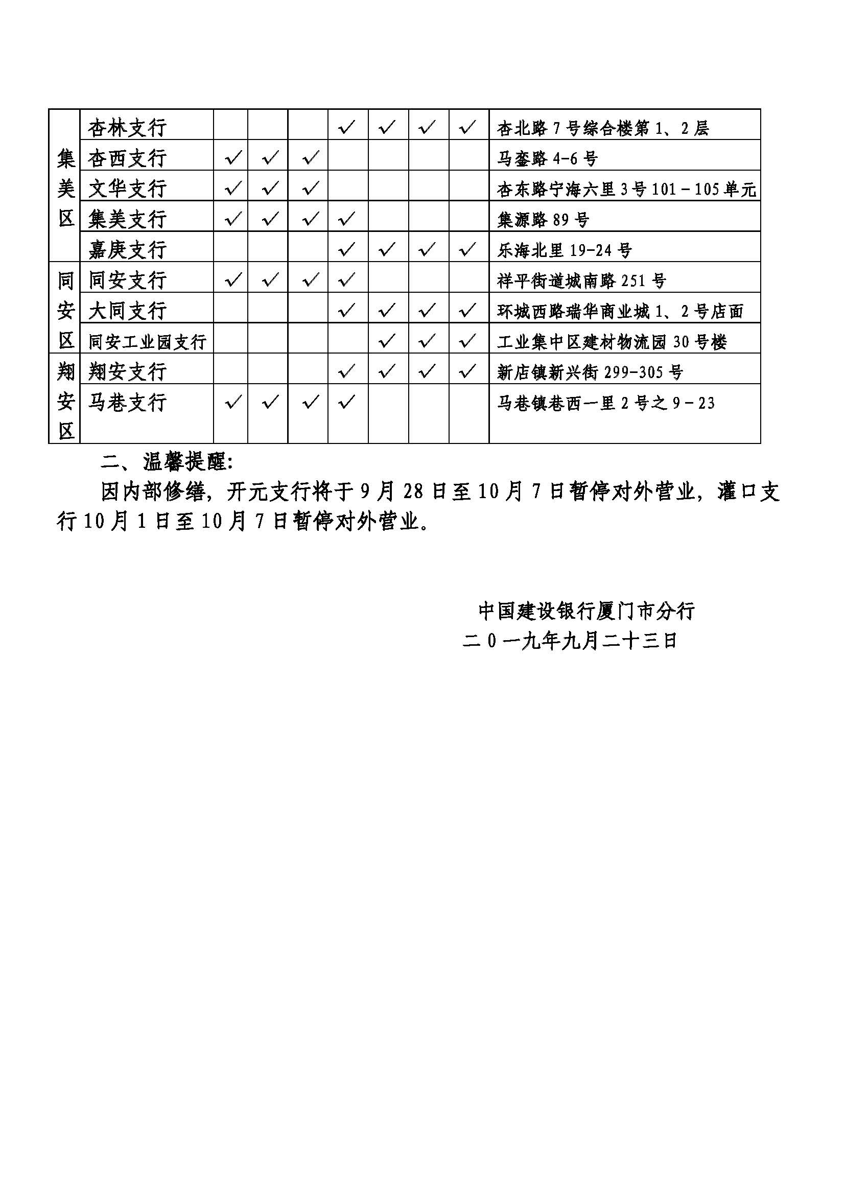 关于2019年国庆节期间厦门建行网点对外营业安排的公告