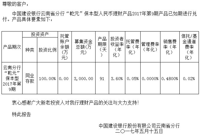 中国建设银行云南省分行“乾元”保本型人民币理财产品清算报告